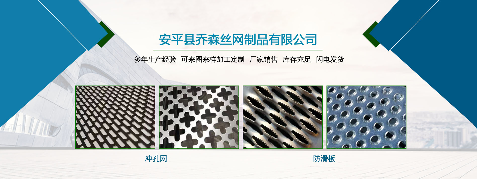 喬森絲網(wǎng)成立于2014年9月,位于中國(guó)絲網(wǎng)之鄉(xiāng)-河北省安平縣,是一家專(zhuān)注于生產(chǎn)金屬絲編織網(wǎng)、金屬網(wǎng)板沖孔及相關(guān)金屬裝飾絲網(wǎng)深加工產(chǎn)品的企業(yè)。從一個(gè)家庭式的小工坊到公司多年來(lái),一直本著以“質(zhì)量求生存,信譽(yù)謀發(fā)展”的生產(chǎn)原則兢兢業(yè)業(yè)穩(wěn)步向前,贏得了 一大批忠實(shí)客戶的廣泛贊譽(yù)。然騏驥一躍,不能十步,駑馬十駕,功在不舍。我們將以更周到的服務(wù),更過(guò)硬的質(zhì)量,不忘初心,為廣大的客戶提供更優(yōu)質(zhì)的服務(wù)。